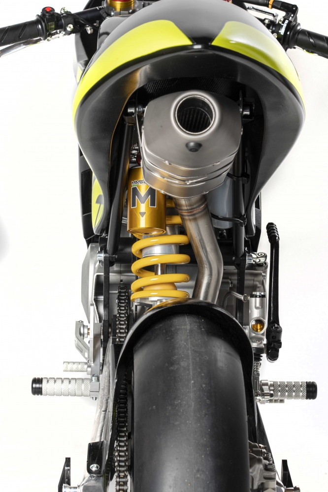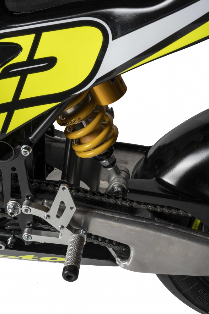 Rear Shock MASELLI with CNC body IN ERGAL; axle 16mm piston diam. 46 travel 30mm F/T, travel 50,4mm F/F Variable wheelbase by 284mm +5 – 4mm. Rebound, compression and spring preload adjustment. MADE IN ITALY